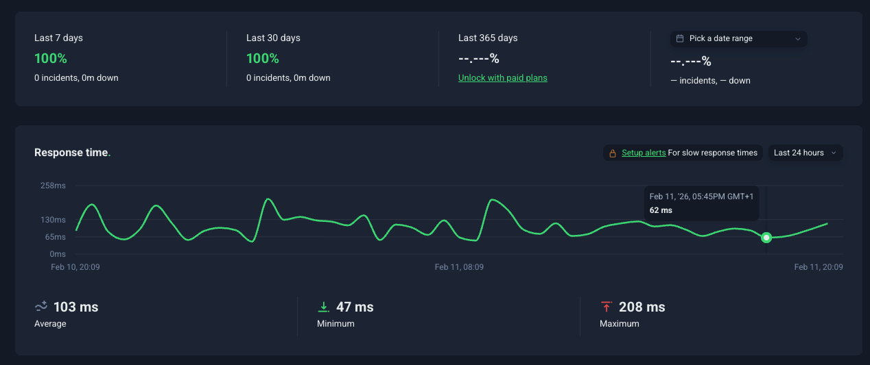 Tropical Server nos ha sorprendido con unos números de rendimiento que lo colocan entre los más rápidos que hemos medido. En nuestra monitorización continua, hemos registrado un uptime perfecto del 100% tanto en los últimos 7 como en los últimos 30 días, sin ningún incidente ni tiempo de inactividad.